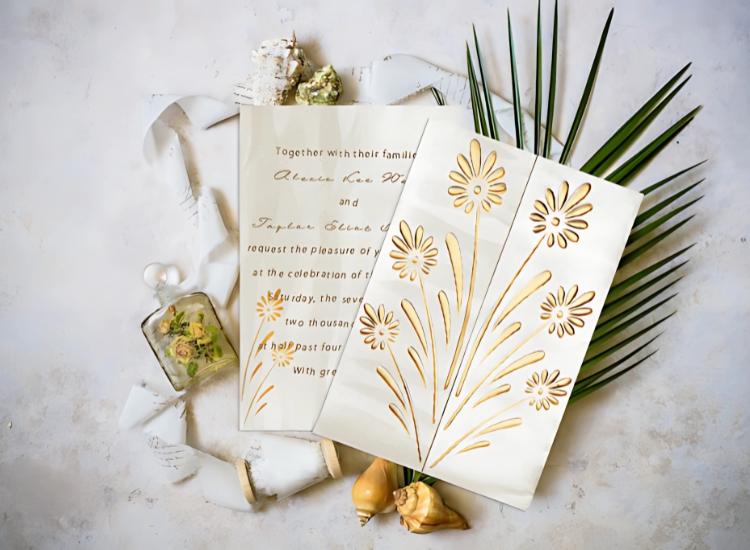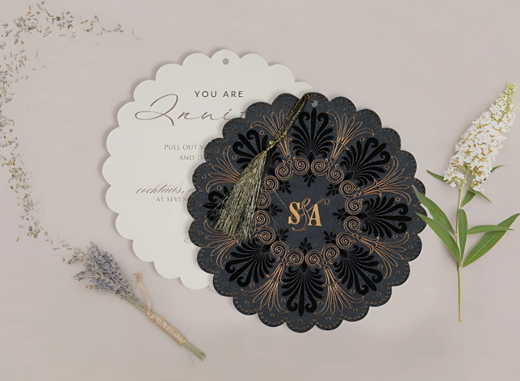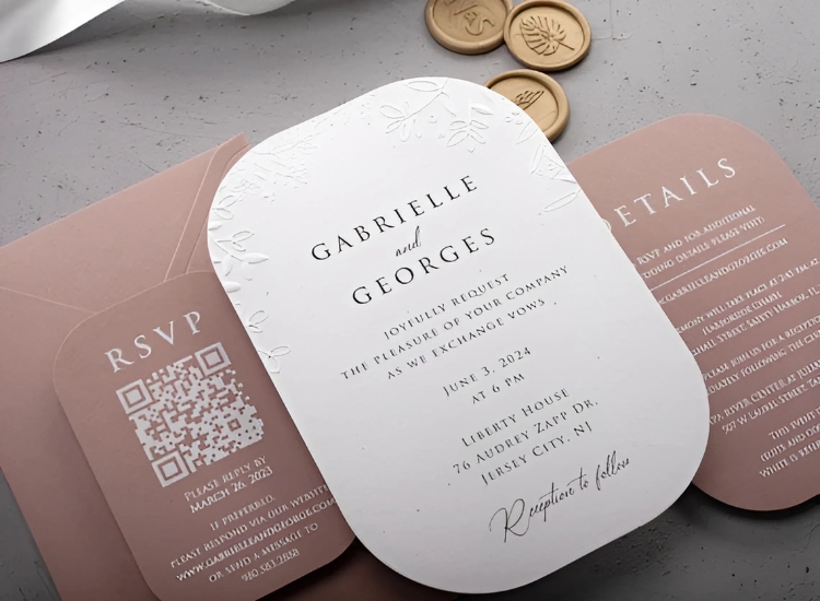 A specialized printing technique called embossing produces a raised arrangement on paper that is comprised of visual appeal, texture, and depth. Together with monograms, styles, or calligraphy, this method accentuates the invitation with the help of special elements, therefore creating a tactile, three-dimensional impact.
