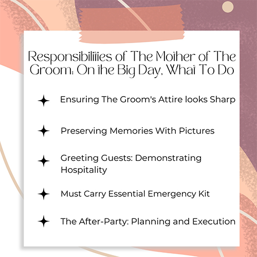 The Mother and the Groom's involvement is one of the wedding's most essential and multi-faceted parts. Her participation aids in organizing a spectacular celebration at every stage, from pre-wedding preparations and Responsibilities on the big day to those in the aftermath. If the Mother of the Groom takes on these roles with poise and Joy, they will profoundly affect the wedding and leave an impression that will last a lifetime. Cheers to the Mothers of the Groom! Your presence brightens the big day!